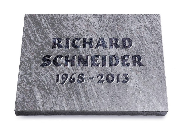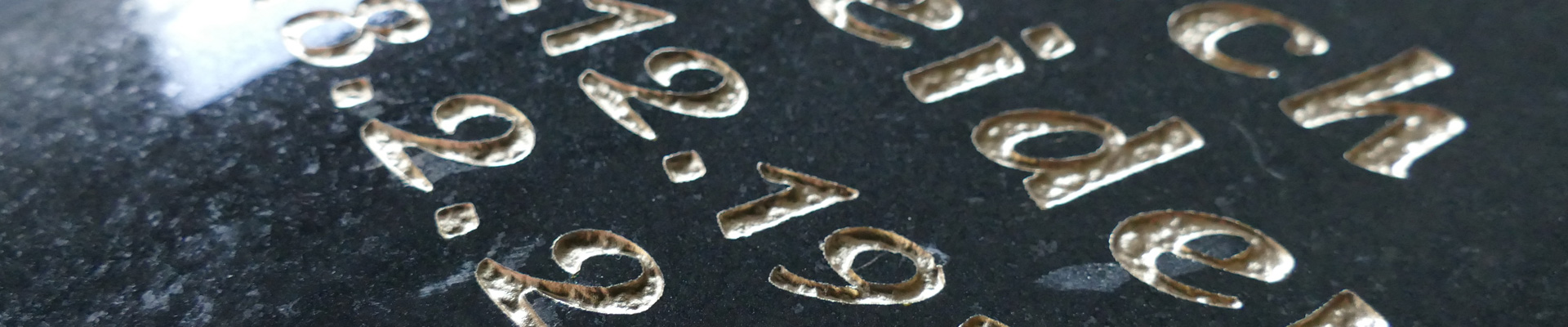 Eine Rasengrabplatten-Beschriftung wird entweder in den Stein graviert (hochwertige Sandstrahlgravur), geschlagen oder als Metallschriftzug aufgesetzt. Bei der ersten Variante erstellt der Steinmetz eine Sandstrahlgravur Ihrer Inschrift, die 2-3 mm tief in den Stein eingearbeitet und anschließend mit Ihrer Wunschfarbe ausgelegt wird.